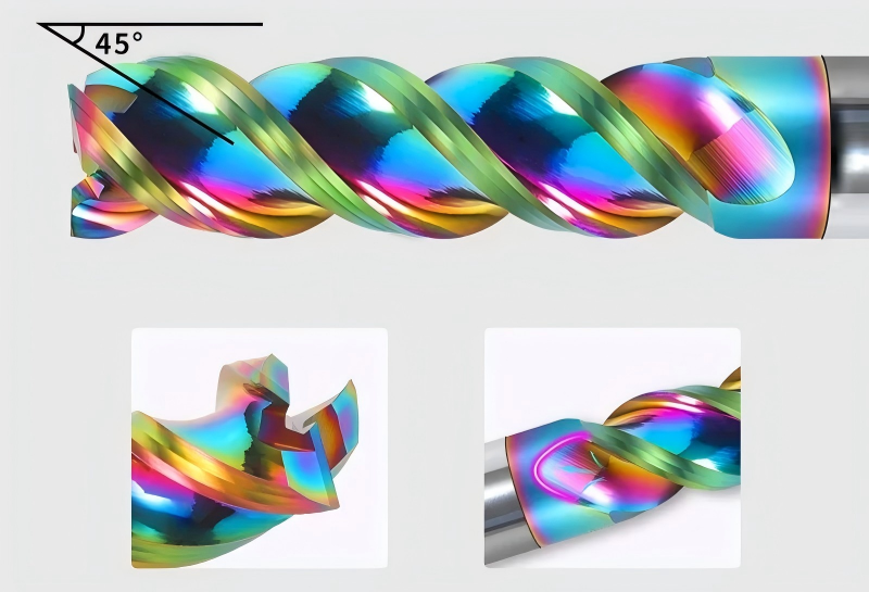 • Helix Angle: High helix angles help reduce cutting forces and improve chip flow.