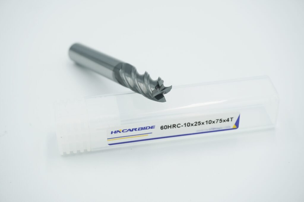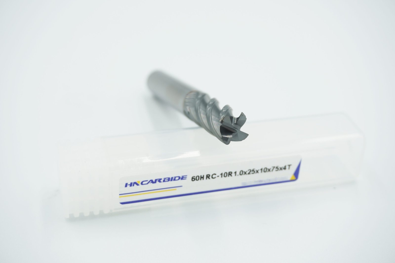HNCarbide HRC60 4 flute corner radius carbide end mill cutter for stainless steel is designed for stable, high-efficiency machining of austenitic and martensitic stainless steels, as well as alloy steels up to 60HRC. Using ultra-fine grain solid carbide end mill cutter substrate and advanced CNC grinding, it delivers excellent wear resistance, edge strength and dimensional accuracy in continuous and light interrupted cutting.