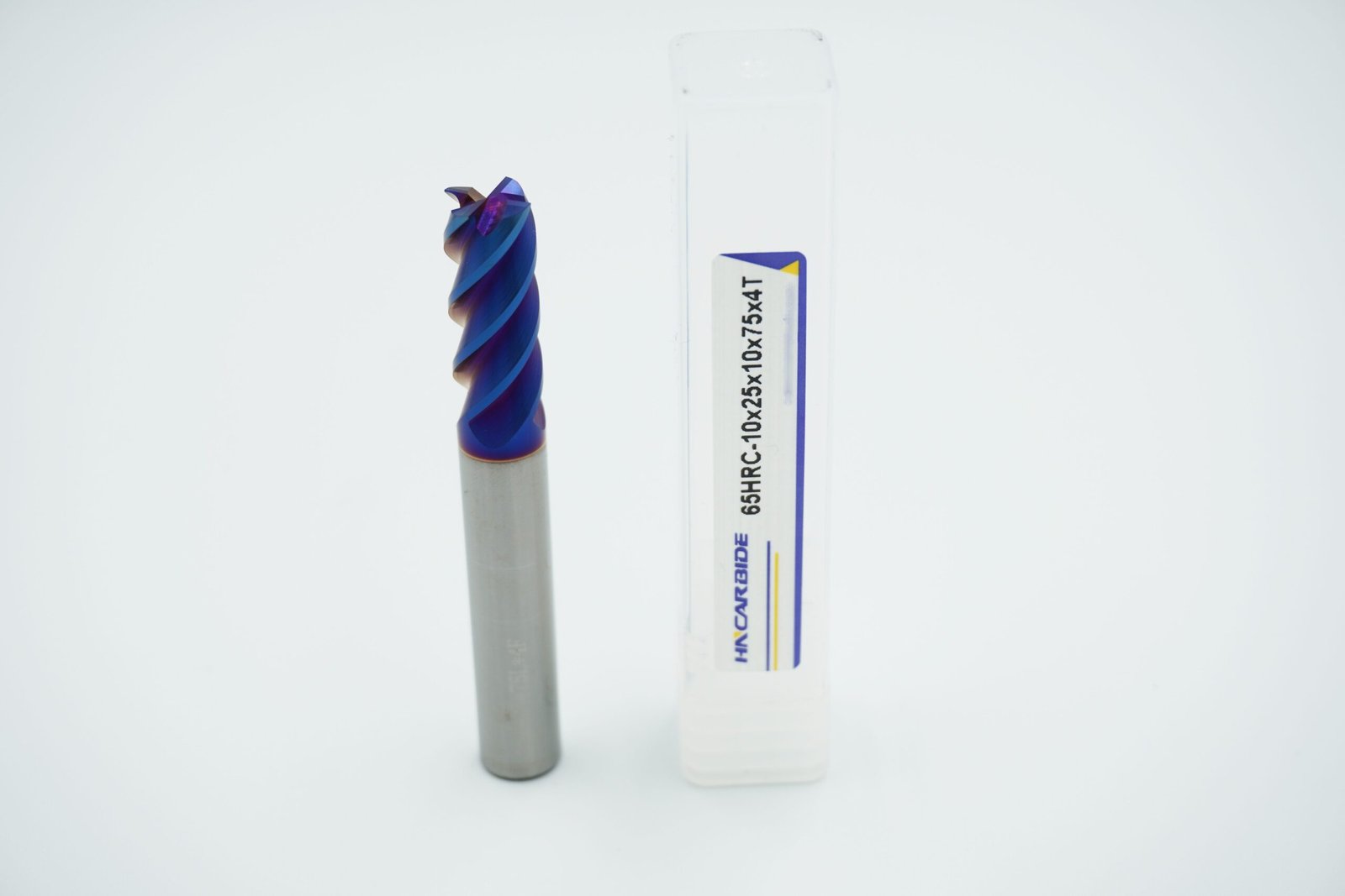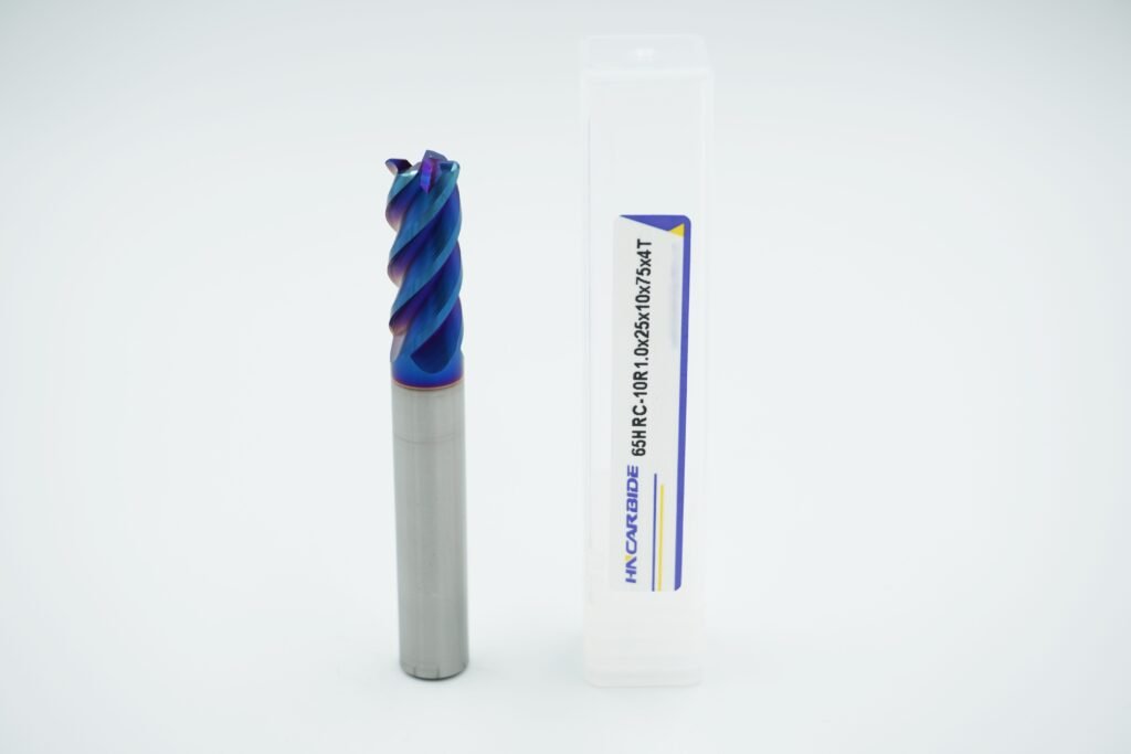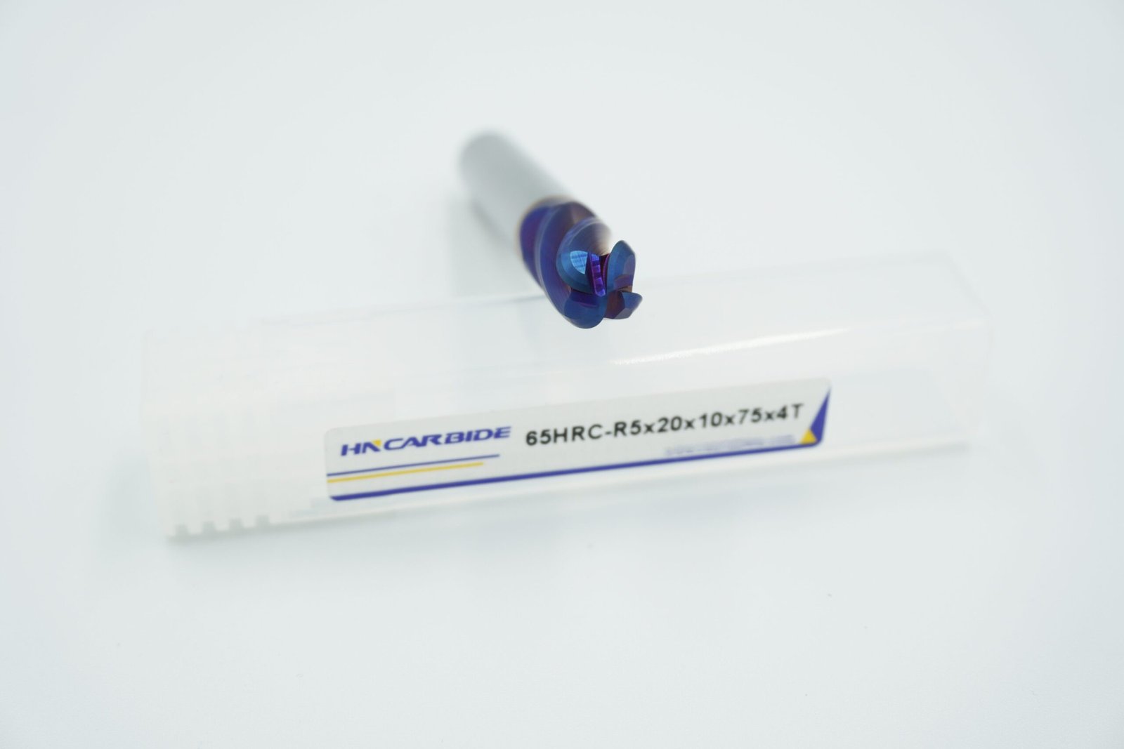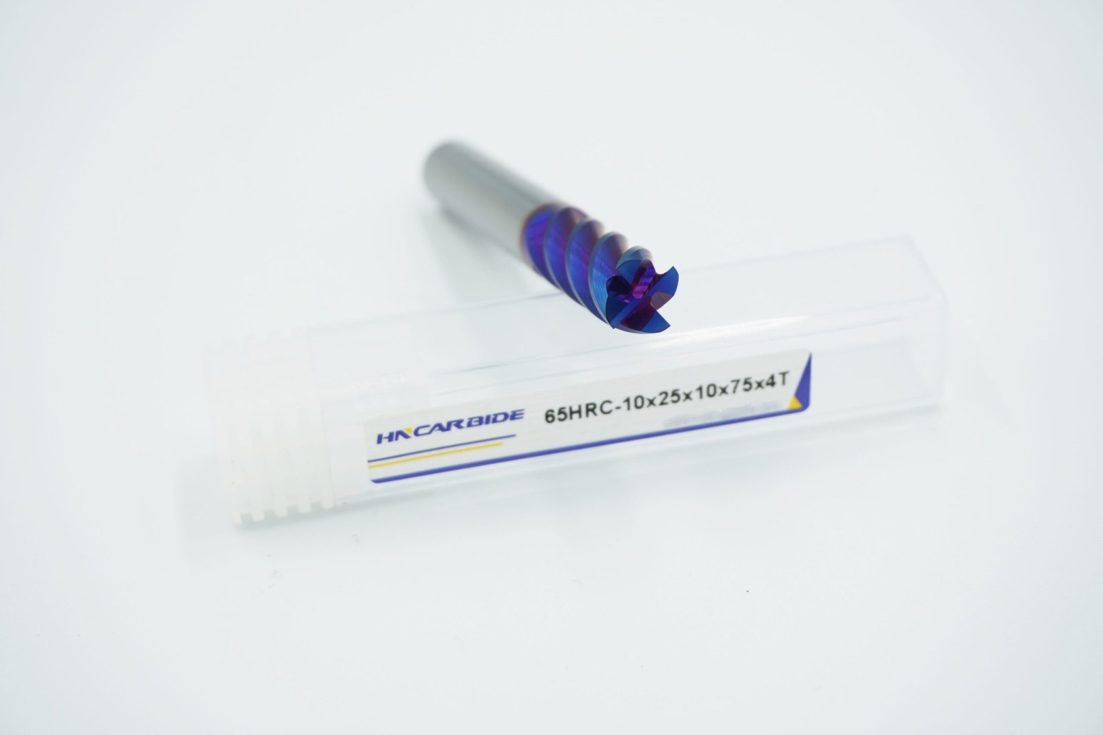 HNCarbide HRC65 4 flute blue nano coated corner radius carbide end mill cutter is designed for high-speed machining of hardened steels, alloy steels and stainless steels up to 65HRC. Manufactured from ultra-fine grain solid carbide end mill cutter substrate and finished on advanced CNC grinding equipment, it provides excellent wear resistance, edge stability and dimensional accuracy at high cutting speeds.
