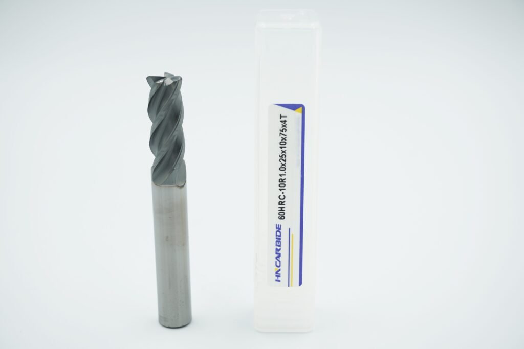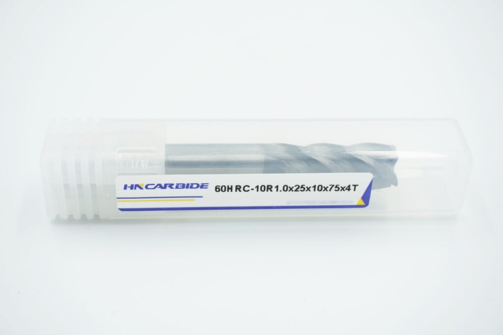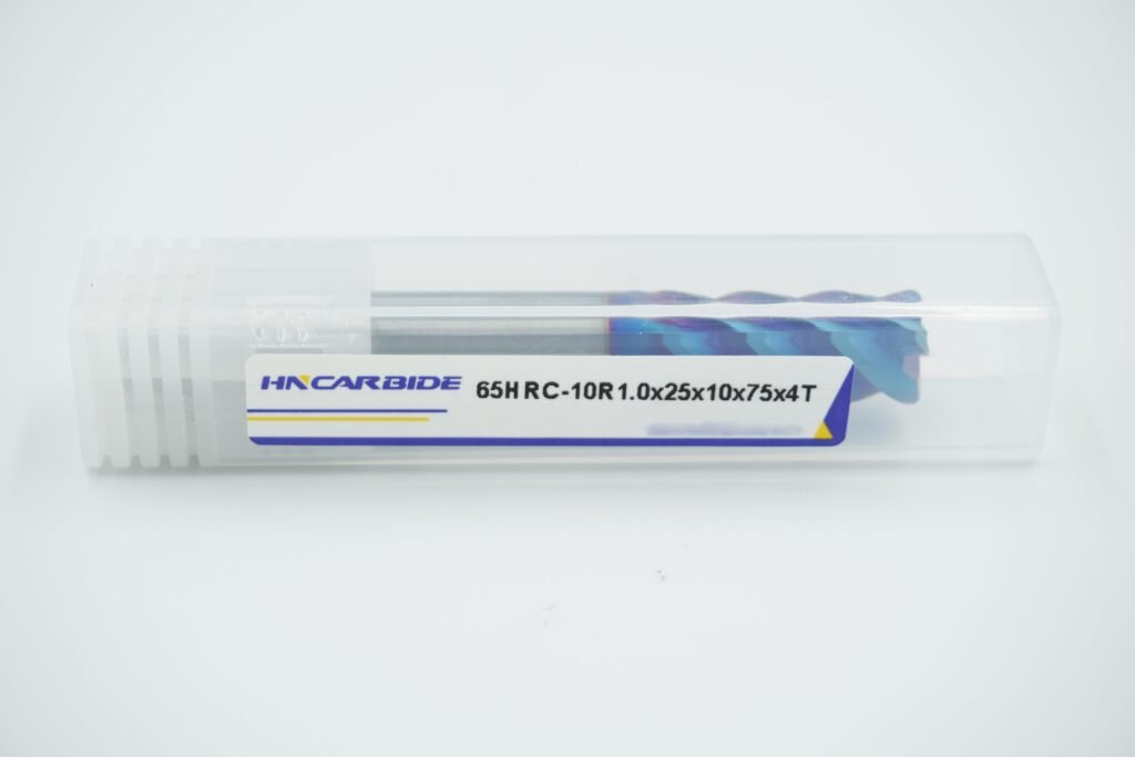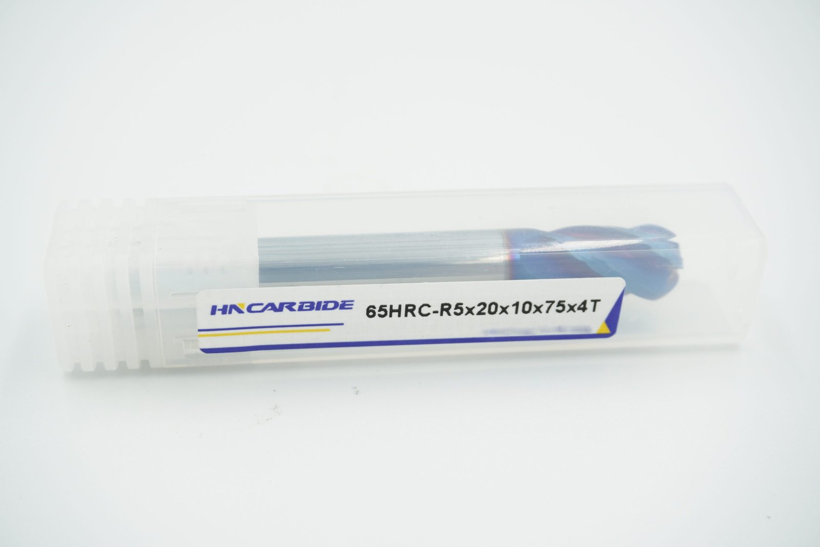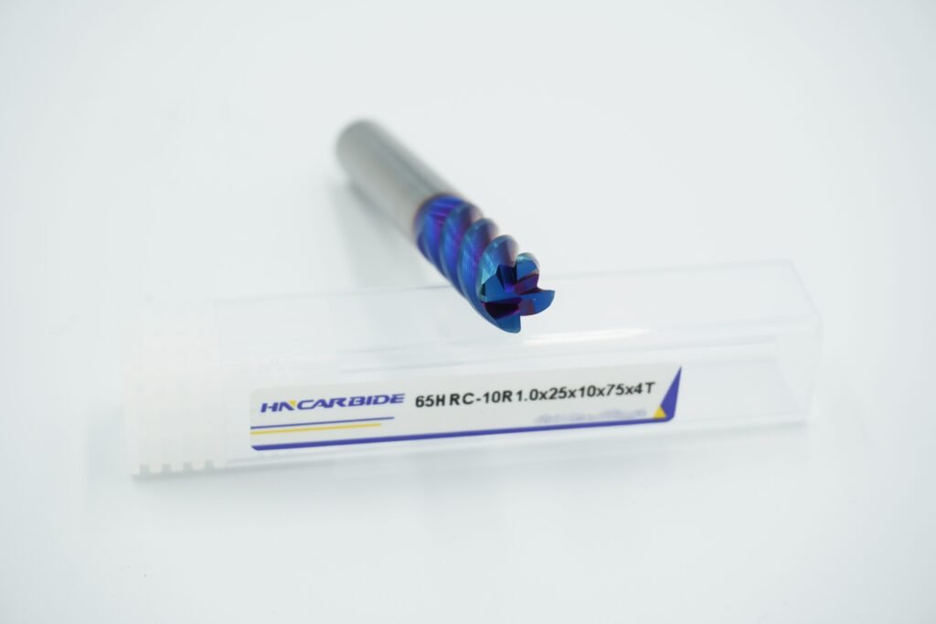 HNCarbide HRC65 4 flute blue nano coated corner radius carbide end mill cutter is designed for high-speed machining of hardened steels, alloy steels and stainless steels up to 65HRC. Manufactured from ultra-fine grain solid carbide end mill cutter substrate and finished on advanced CNC grinding equipment, it provides excellent wear resistance, edge stability and dimensional accuracy at high cutting speeds.
