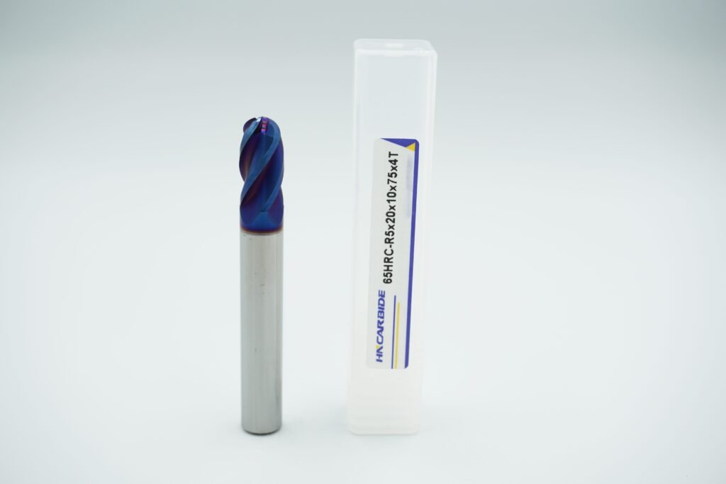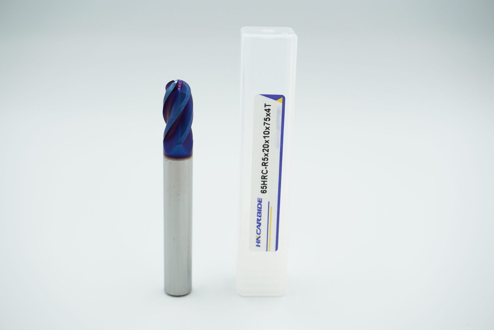 HNCarbide 65HRC blue nano coated 4 flute ball carbide end mill cutter is designed for high-speed finishing and 3D profiling of hardened steel, alloy steel and stainless steel up to 65HRC. Made from ultra-fine grain solid carbide end mill cutter substrate and ground on advanced CNC machines, it offers excellent wear resistance, edge stability and long tool life under high-temperature cutting conditions.
