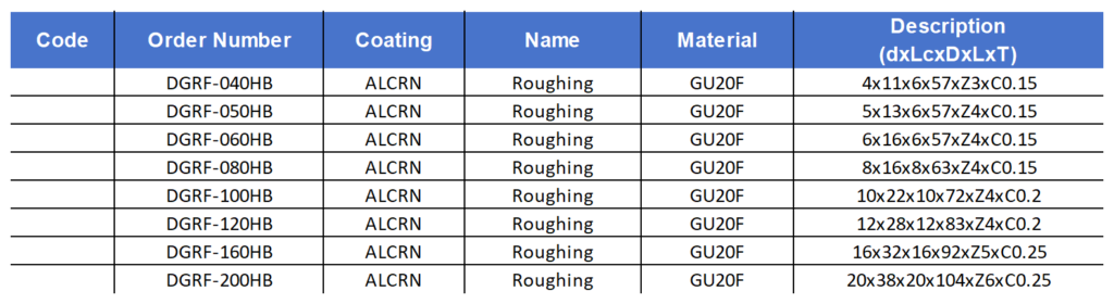 | XD4877 | DGRF-060HB | ALCRN | Roughing | GU20F | 6x16x6x57xZ4xC0.15 |