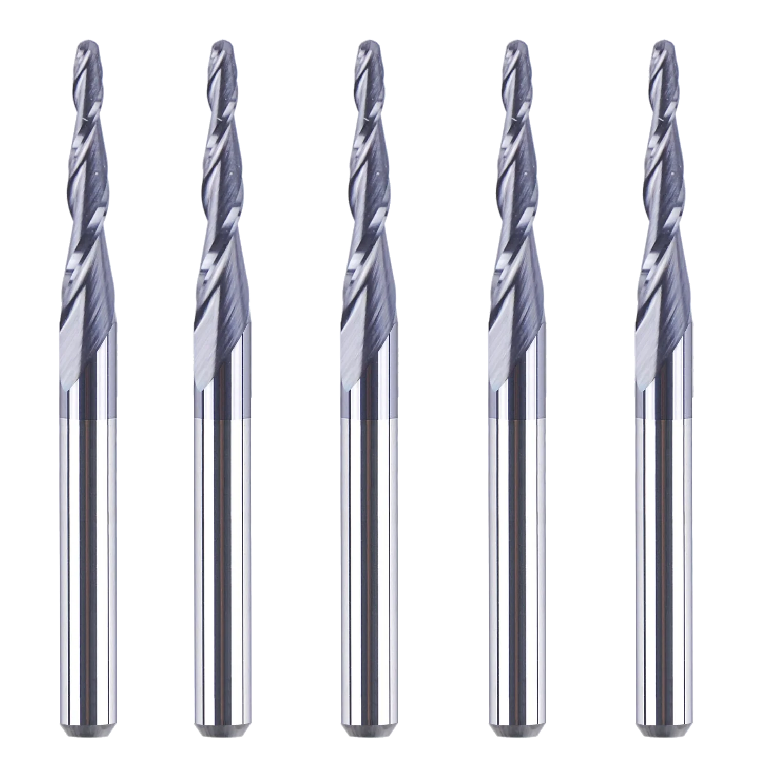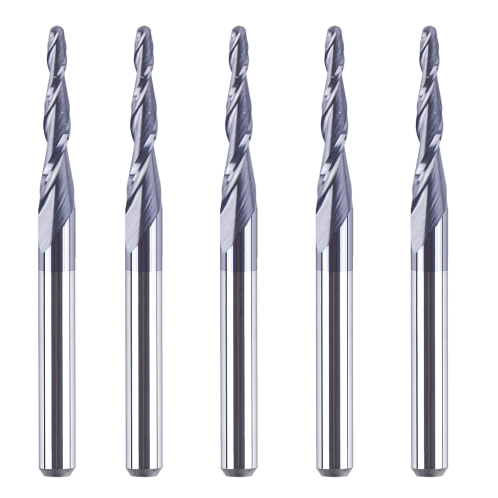 A taper ball nose end mill (also written as ball nose taper end mill) is the tool of choice for 3D surfaces, fillets, and smooth blending—especially in mold making. The ball nose tip avoids sharp transitions and is excellent for finishing freeform geometry.