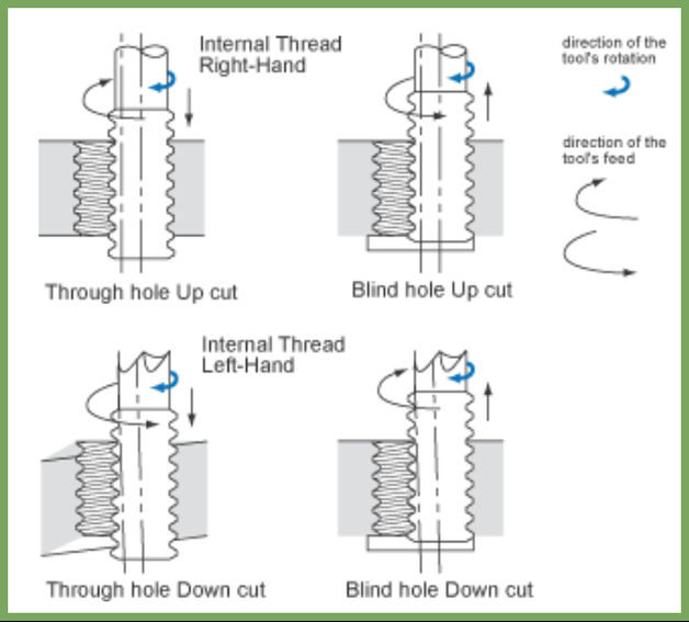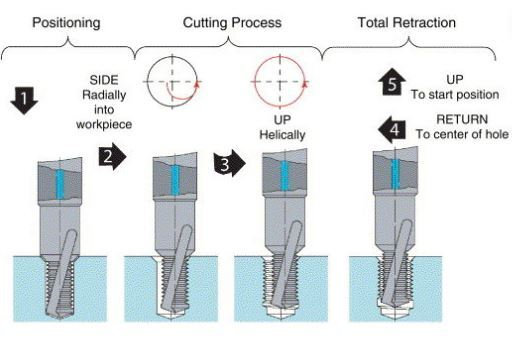 Unlike a tap, which cuts or forms the entire thread profile in one axial motion, a thread mill moves in a controlled circular path while the Z-axis advances by one pitch per revolution.